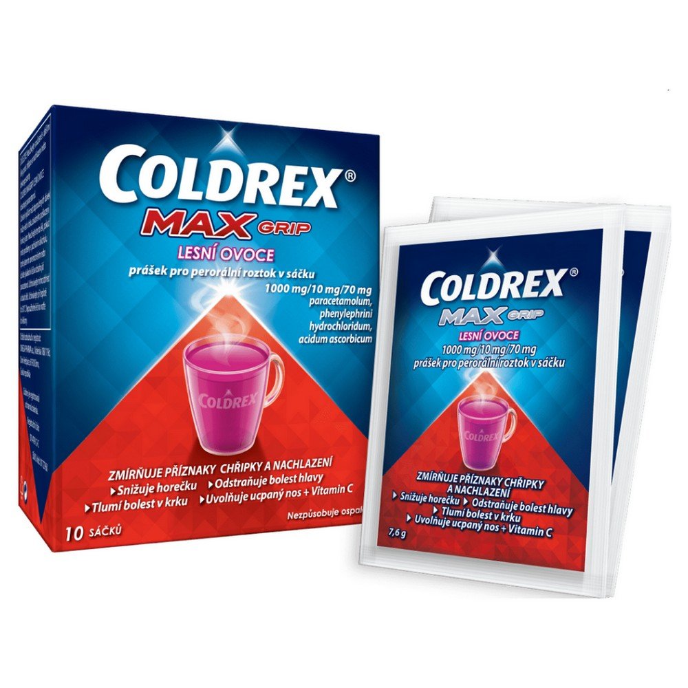 The medicinal product is intended for the treatment of the most common symptoms of flu and colds: headache, neck pain, high temperature, fever Image of forest fruit powder COLDREX MAX Grip for oral solution, 10 sachets, cough, nasal congestion, runny nose, joint pain , fatigue and exhaustion. Strong effect – intended for adults over 65 kg.