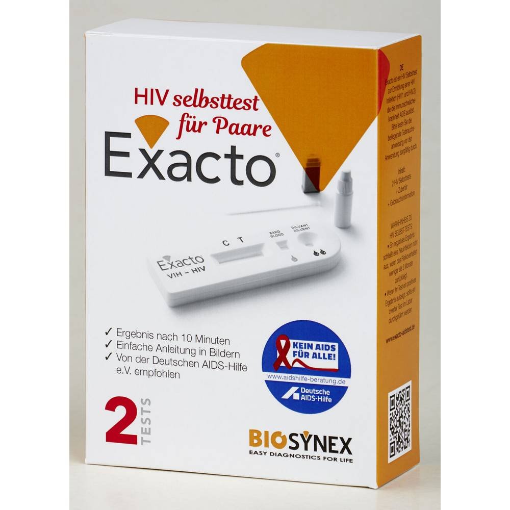 Exacto HIV self-test (pack size: 1 pc) is a safe HIV test for your own application with 99.9% reliability & CE mark.
