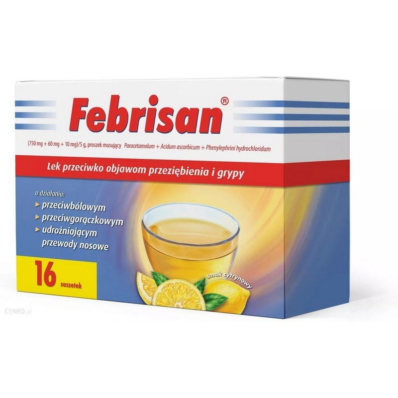 Febrisan is an over-the-counter medicine recommended for the treatment of cold and flu symptoms. The combination of 3 active substances makes Febrisan fight the most common symptoms of colds and flu. Paracetamol has analgesic and antipyretic effects.