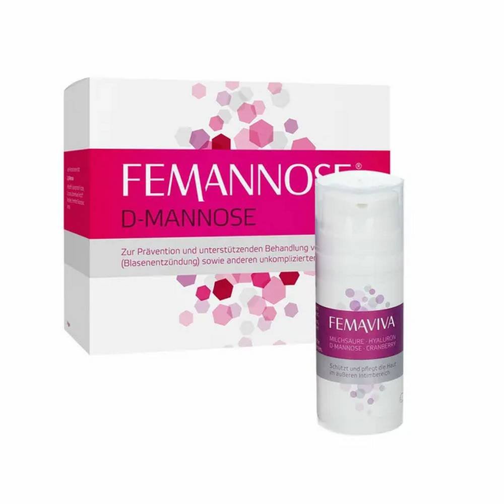 FEMANNOSE® N D-Mannose + FEMAVIVA Gel are a combination of products designed to support urinary tract and vaginal health. FEMANNOSE® N contains D-Mannose, a natural sugar that helps prevent urinary tract infections (UTIs) by reducing bacterial adhesion in the urinary system. FEMAVIVA Gel is a gentle, moisturizing vaginal gel formulated to maintain natural pH balance, prevent irritation, and support overall feminine hygiene.