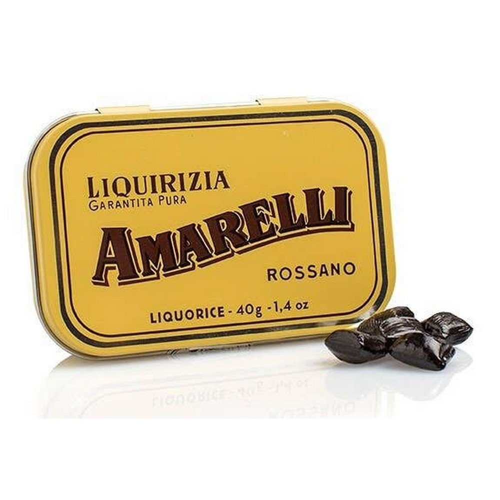 Gold spiced Amarelli liquorice 40 g in metal box. The purest liquorice is made in regular pieces. The practical packaging allows you to always have pure Amarelli liquorice with you. Pure licorice: