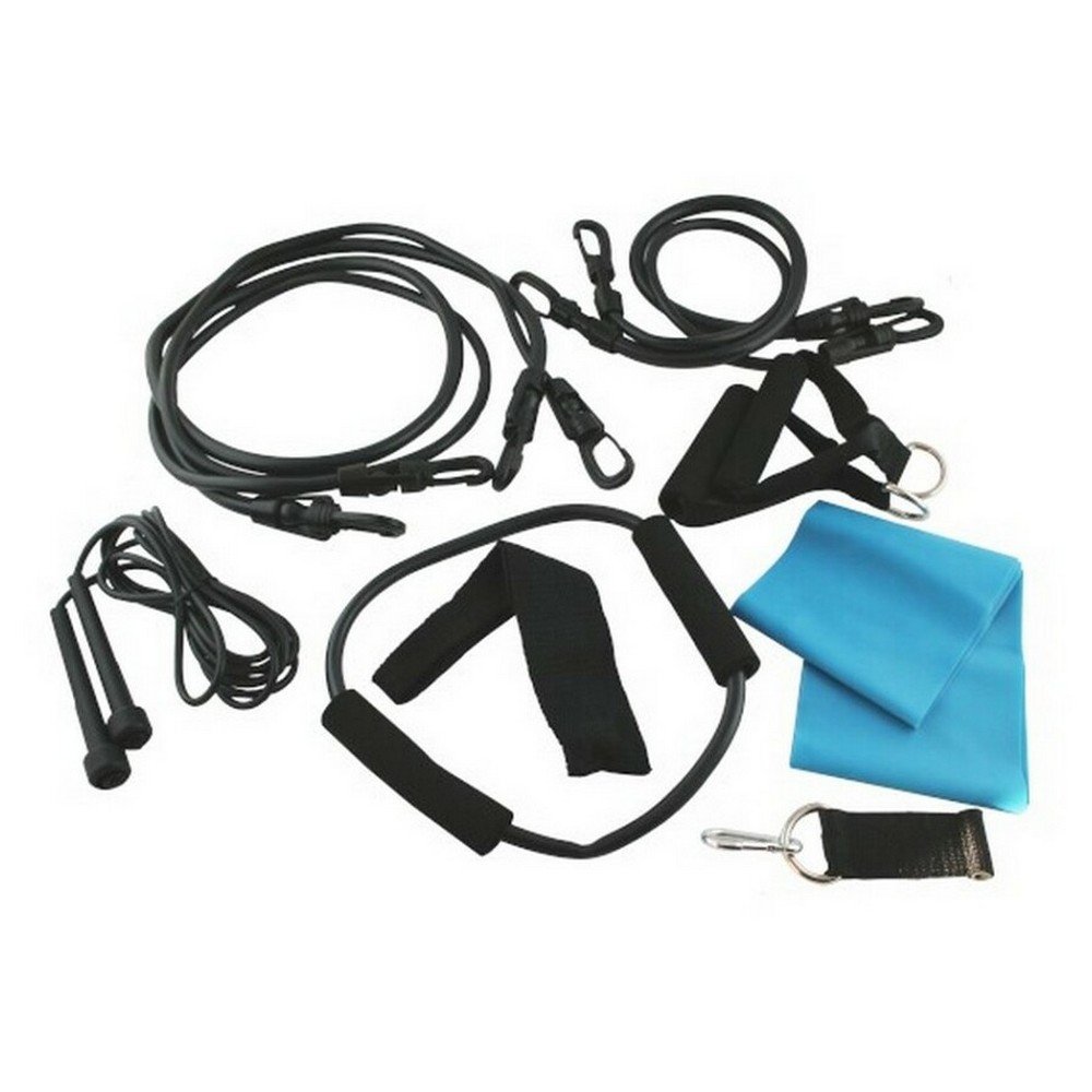 TX02 The set consists of 4 – resistance rubber, 1 – elastic band, 1 – fastening belt, 2 – handles 1 – Ankle attachment, 1 – door attachment, jump rope.