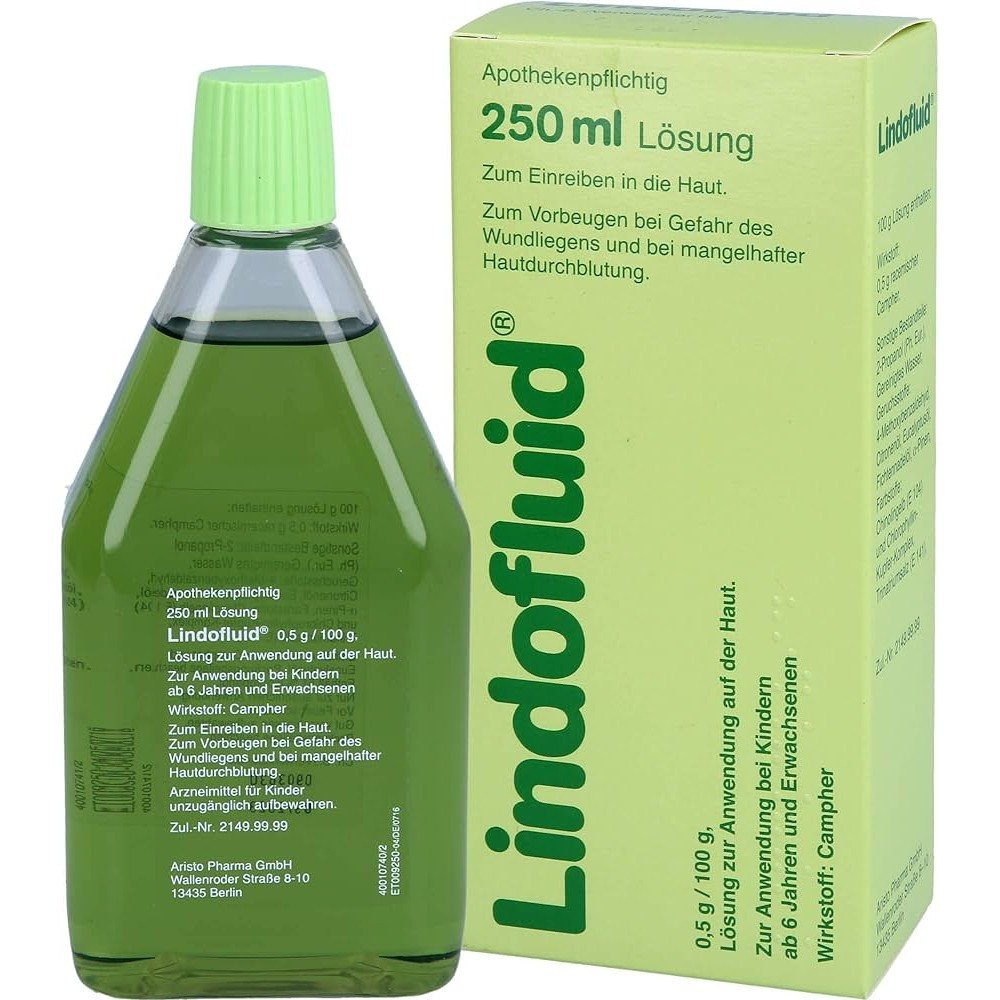 Lindofluid 0.5g/100g (pack size: 250 ml) contains Campher and natural essential oils of spruce, eucalyptus, lemon and pine, which give the solution a refreshing fragrance. The Lindofluid 0.5g/100g (pack size: 250 ml) reaches the deeper layers of the skin and develops its pain -relieving and circulatory -promoting effect. Lindofluid 0.5g/100g (pack size: 250 ml) is applied to the skin with a relaxing massage. There it has a cooling and extremely beneficial effect.