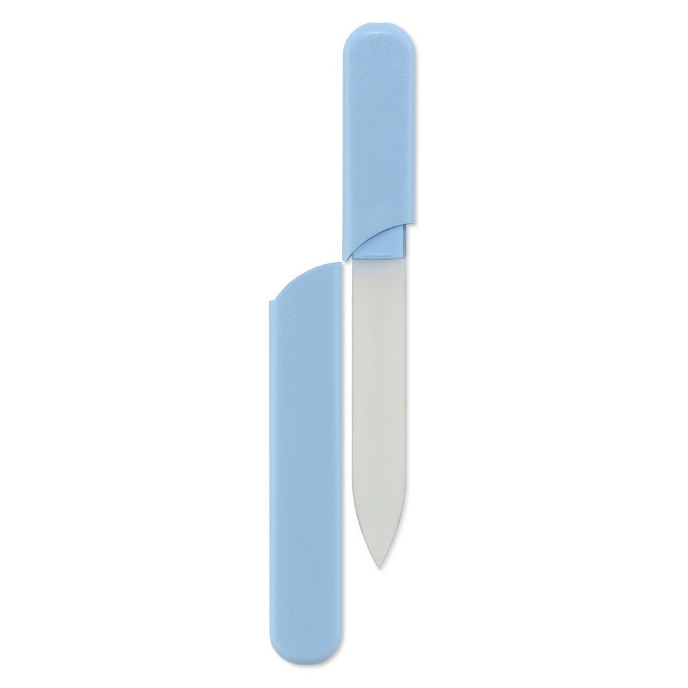 Glass nail file in hard plastic case for extra damage resistance, 125mm/4.92 inches long; Light Blue color. Czech made glass nail file.