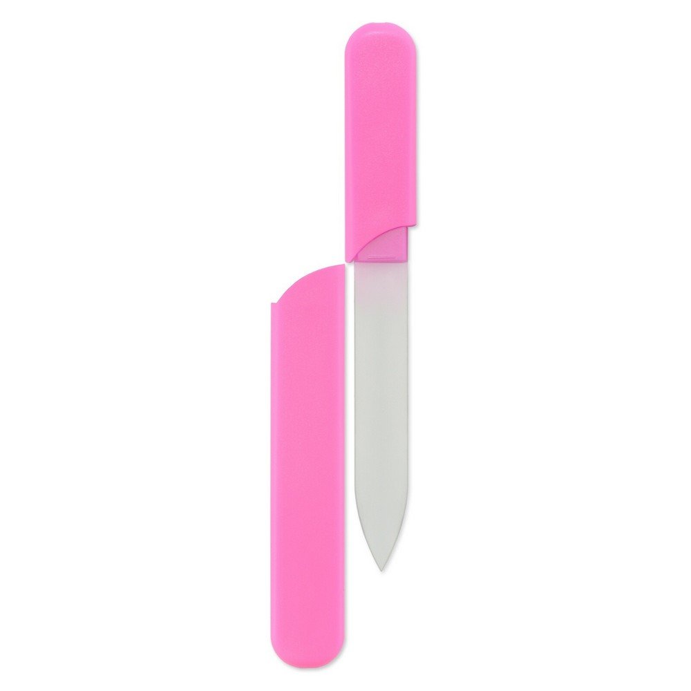 Glass nail file in hard plastic case for extra damage resistance, 125mm/4.92 inches long; Pink color. Czech made glass nail file.