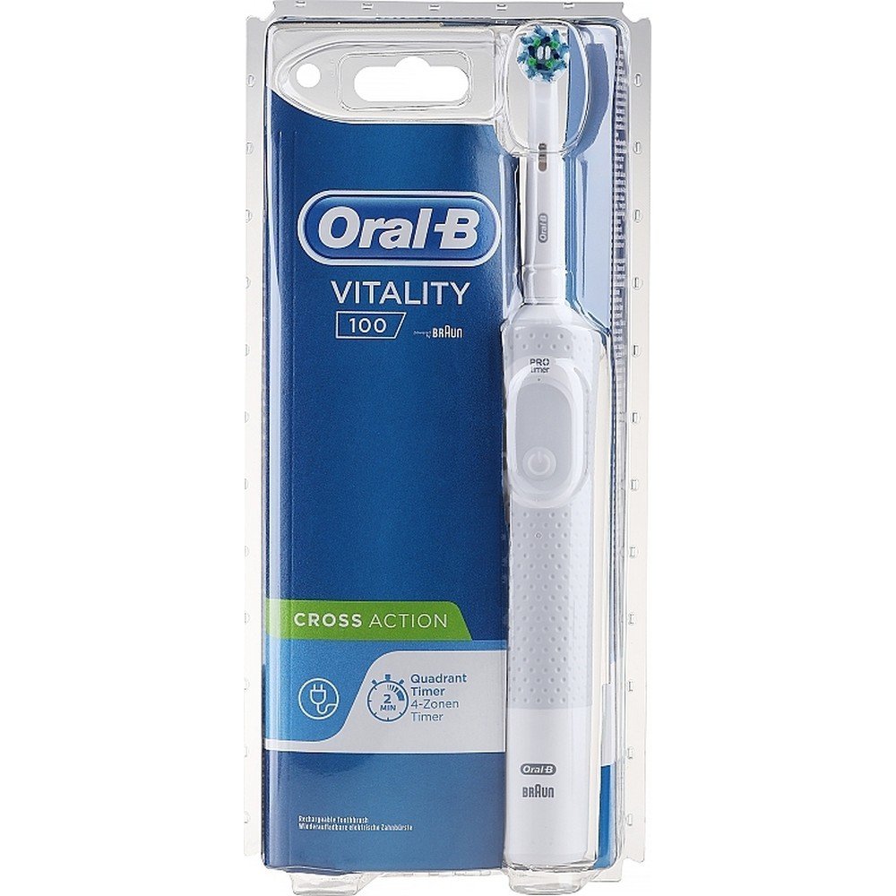 he Oral-B Vitality 100 CrossAction Rechargeable Electric Toothbrush offers clinically proven superior cleaning compared to a conventional manual toothbrush and is therefore the ideal entry-level model for electric dental care. The professional CrossAction brush head wraps around each tooth with its 16 degree angled bristles while using 2D cleaning technology through oscillating and rotating movements Plaque is removed better than with a conventional manual toothbrush. The timer in the handpiece helps you brush your teeth like at the dentist recommended to brush for 2 minutes.