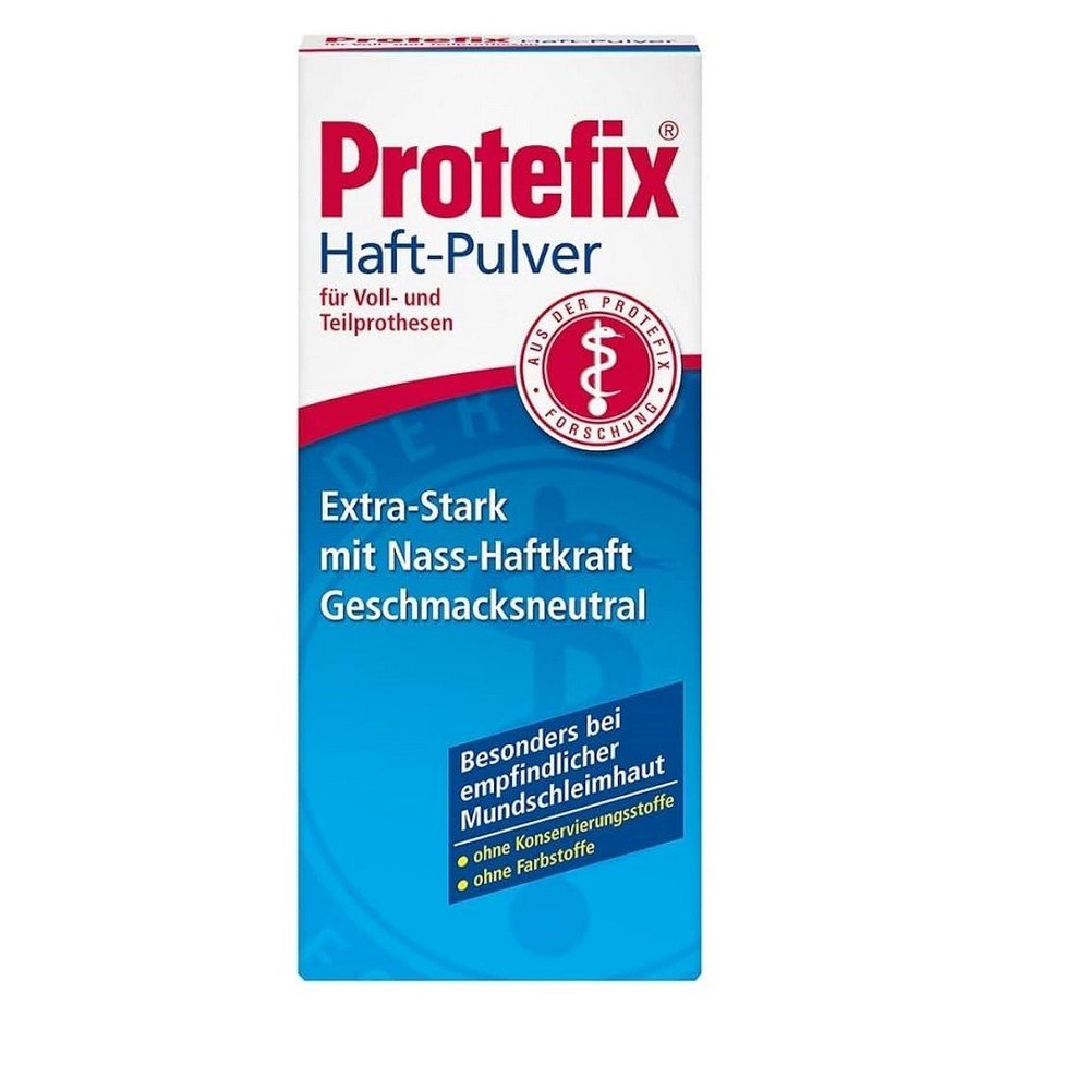 The Protefix adhesive powder extra-strong with wet liability gives a safe hold and is ideal for less prison problems and thin saliva. The Protefix adhesive powder consists of 100% sodium alginate, a well-tolerable substance on a natural basis, and is therefore very well tolerated, especially for the sensitive oral mucosa. Protefix adhesive powder is odor and tasteless and has proven itself in many years.