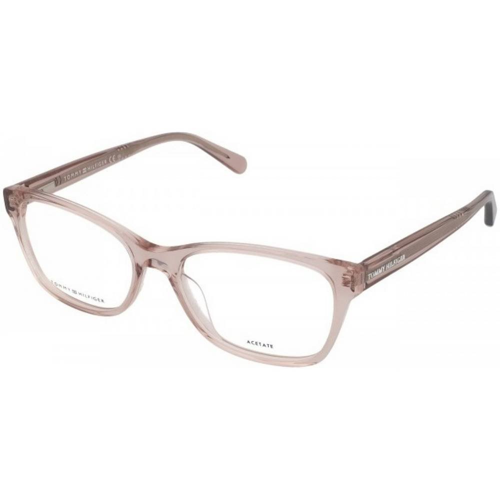 They have a rectangular shape, which is ideal for round face types. The frames of the glasses are pink. The frames of the glasses are transparent. . These glasses have flexible hinges, making them great for those who take their glasses off frequently. The main material of the glasses is light and durable plastic.
